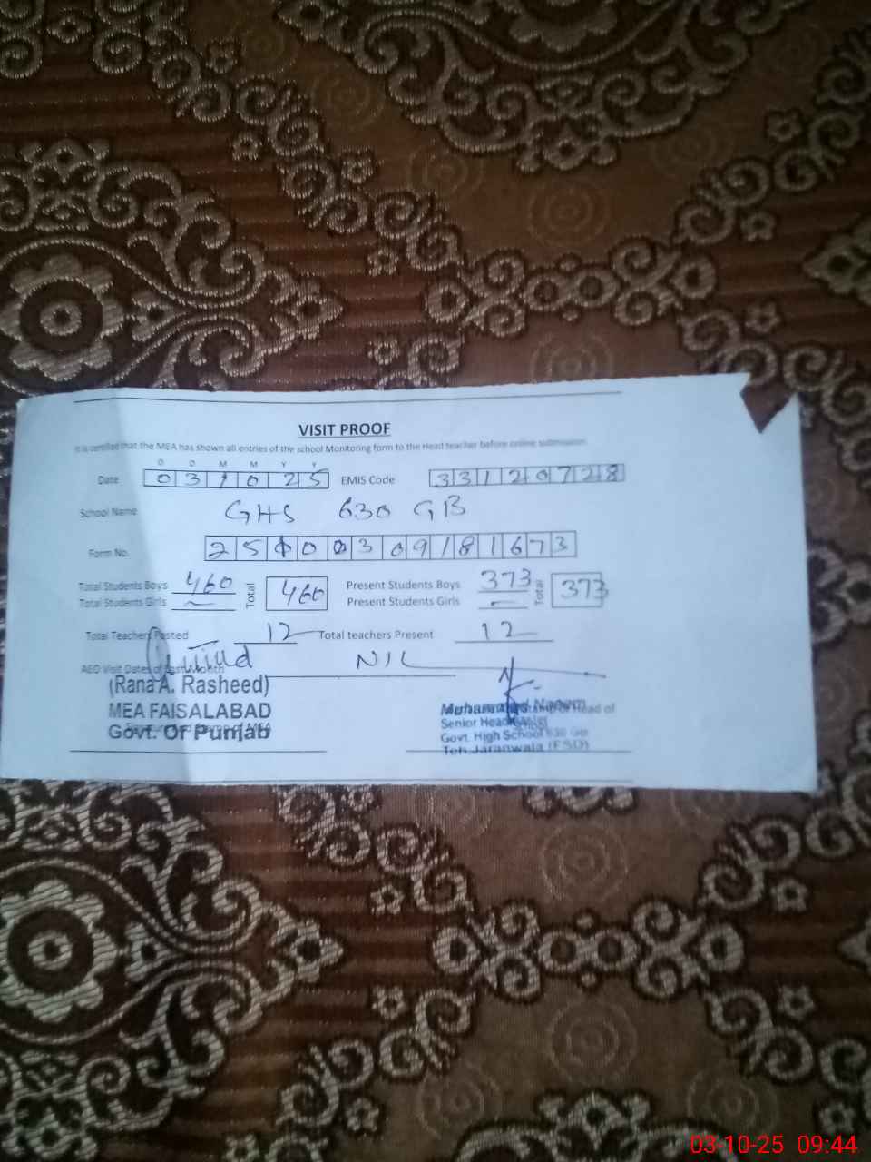 | EMIS Code: 33120728 | Name of School: GHS CHAK NO 630 GB | |||