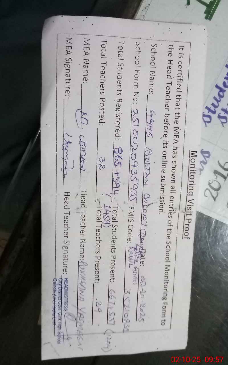 | EMIS Code: 35210831 | Name of School: GGHS BOSTAN COLONY QAINCHI AMER SIDHU (EX-MCL) | |||