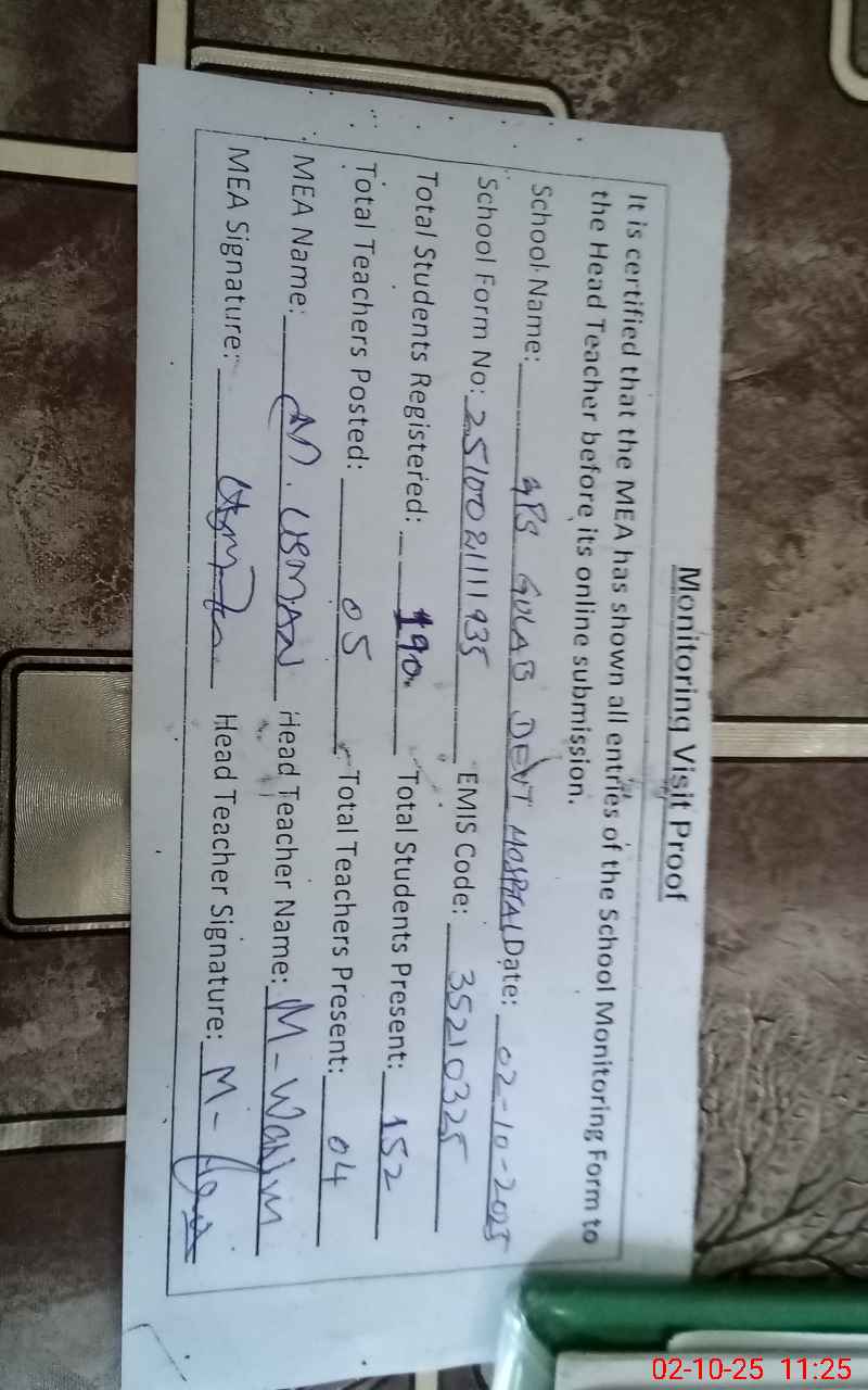 | Certified that this School was Inspected by the Undersigned MEA/DMO Today and the Information Stated Above is as Per Record. | |||||