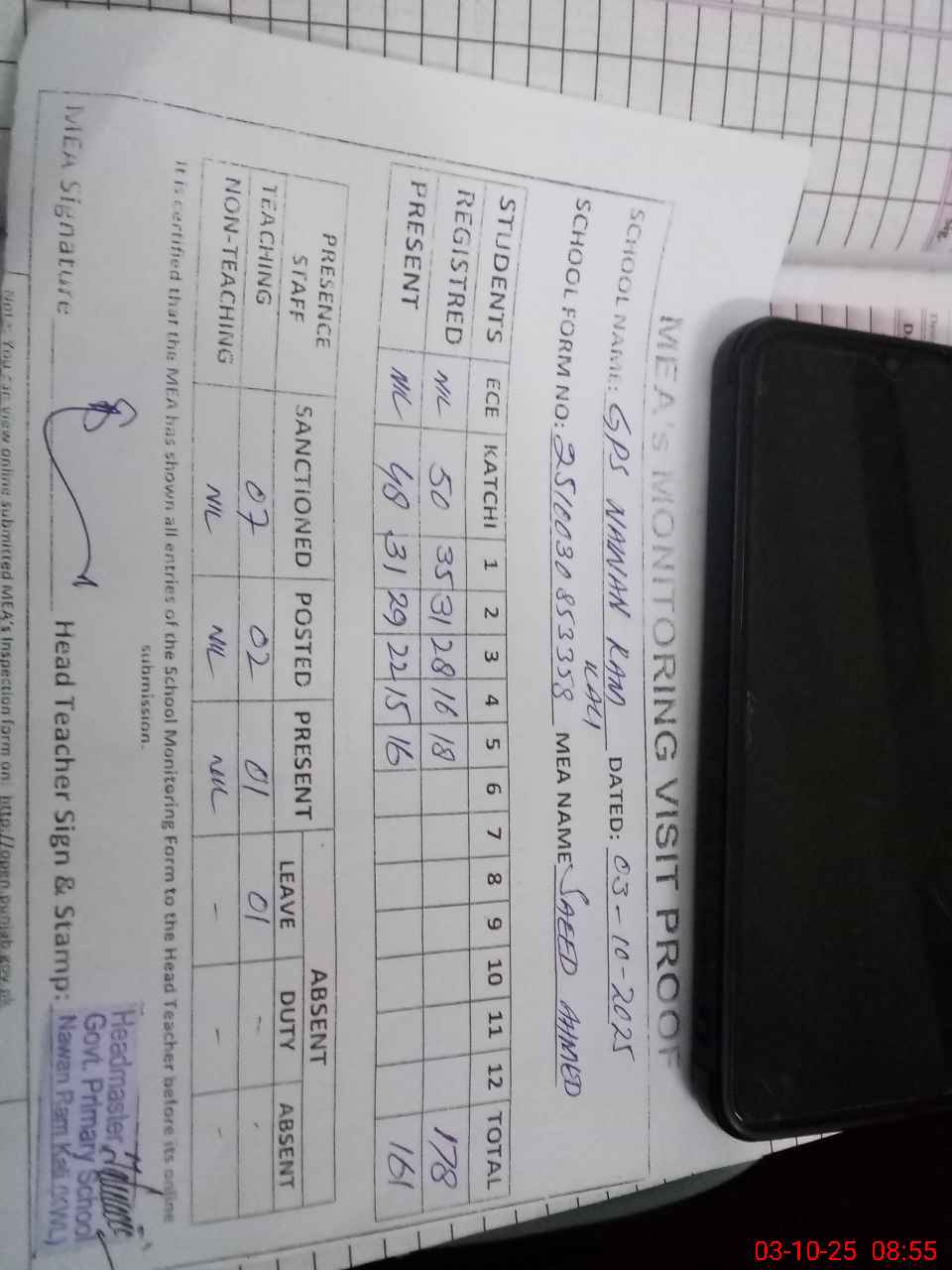 | Attendance Register | Head Teacher | MEA with School | Visit Proof |