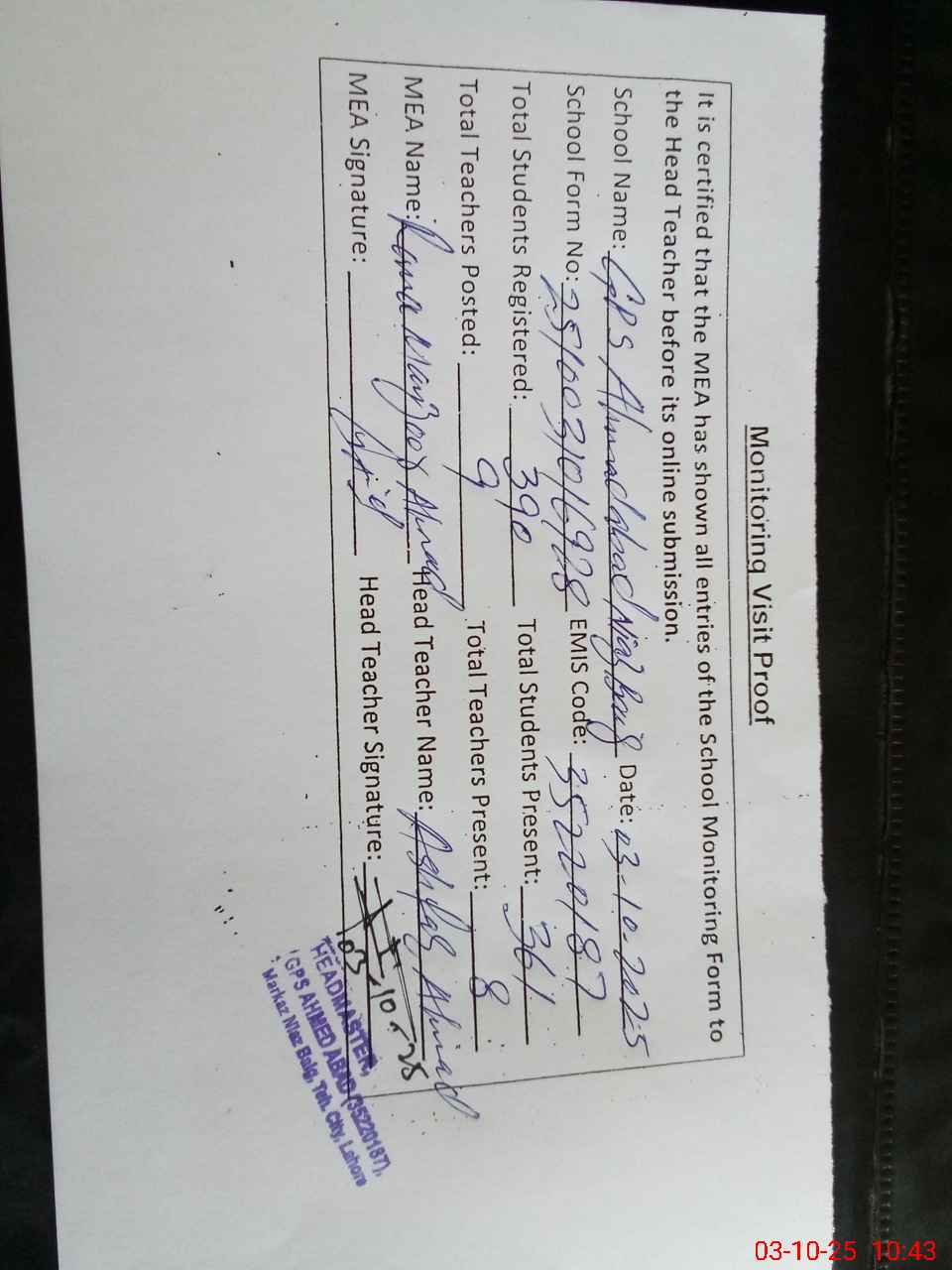 | EMIS Code: 35220187 | Name of School: GPS AHMEDABAD NIAZBAIG LAHORE | |||