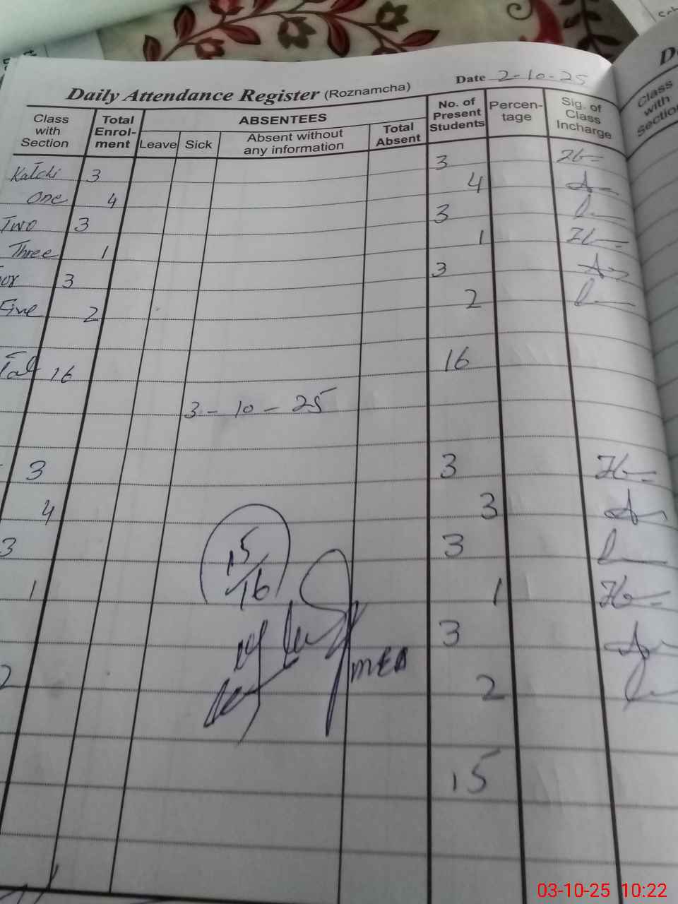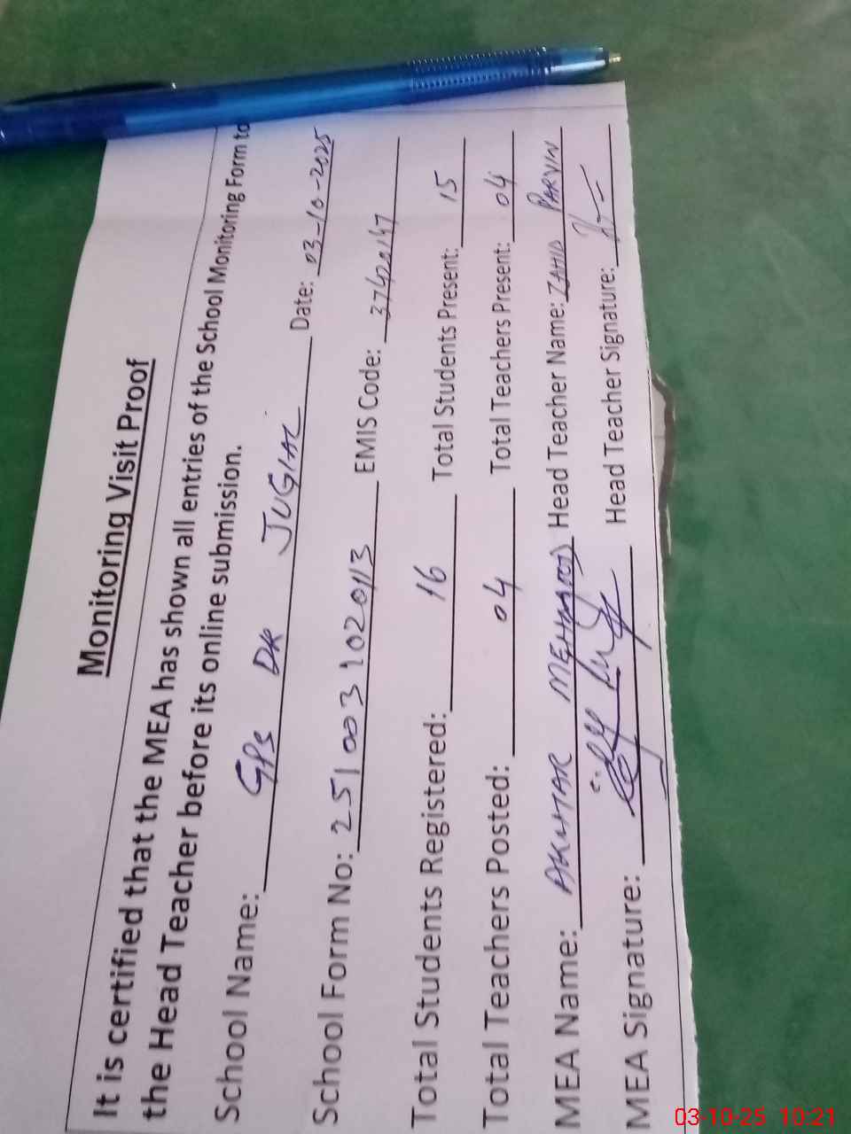 | Attendance Register | Head Teacher | MEA with School | Visit Proof |