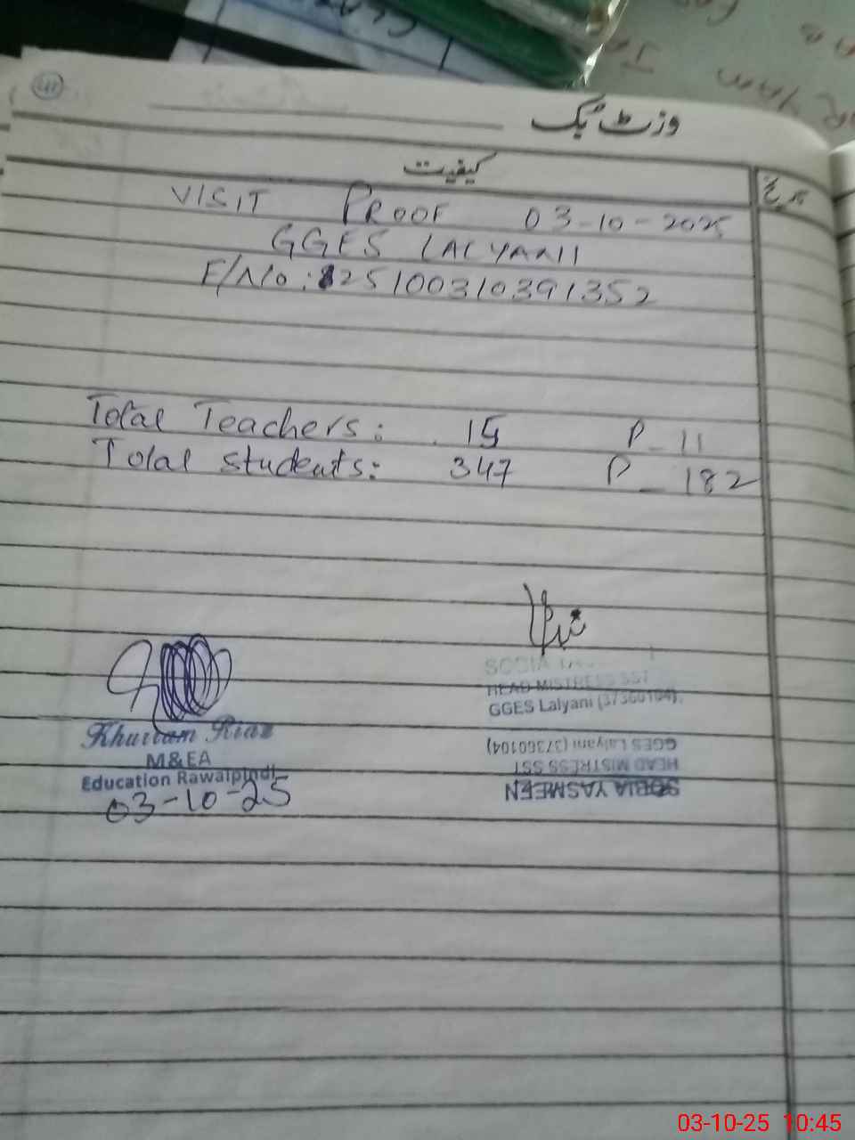 | Certified that this School was Inspected by the Undersigned MEA/DMO Today and the Information Stated Above is as Per Record. | |||||