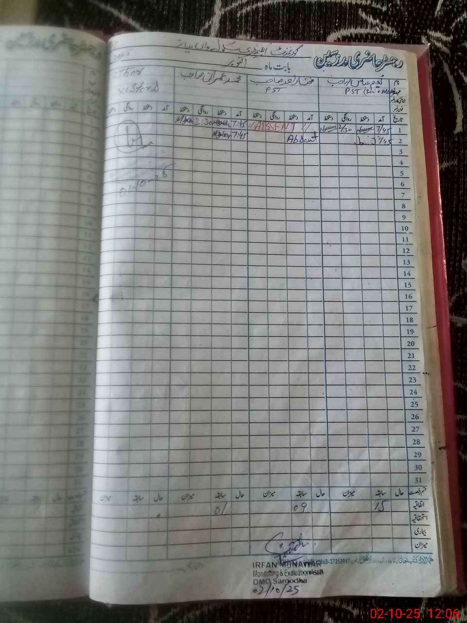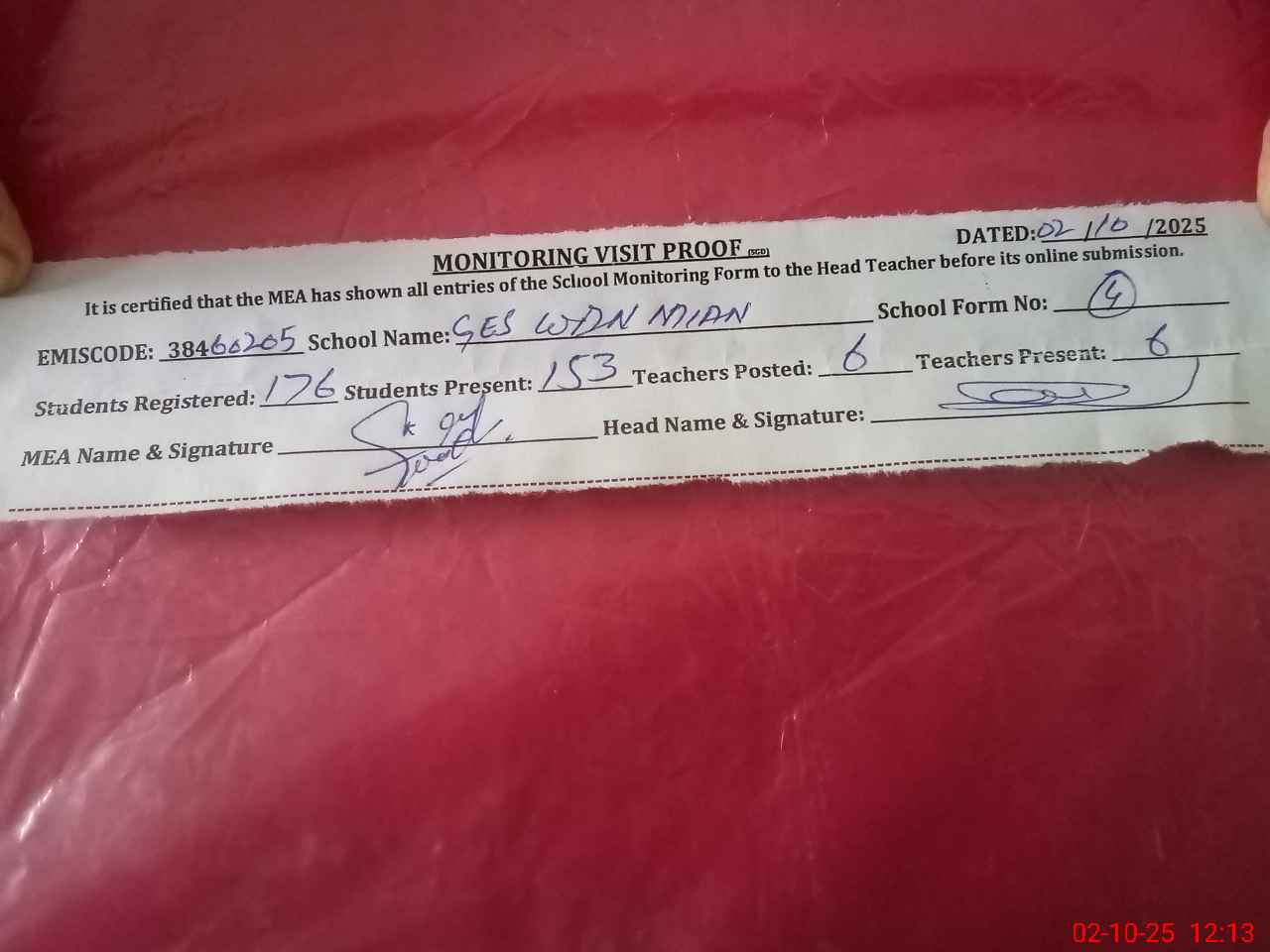 | Attendance Register | Head Teacher | MEA with School | Visit Proof |