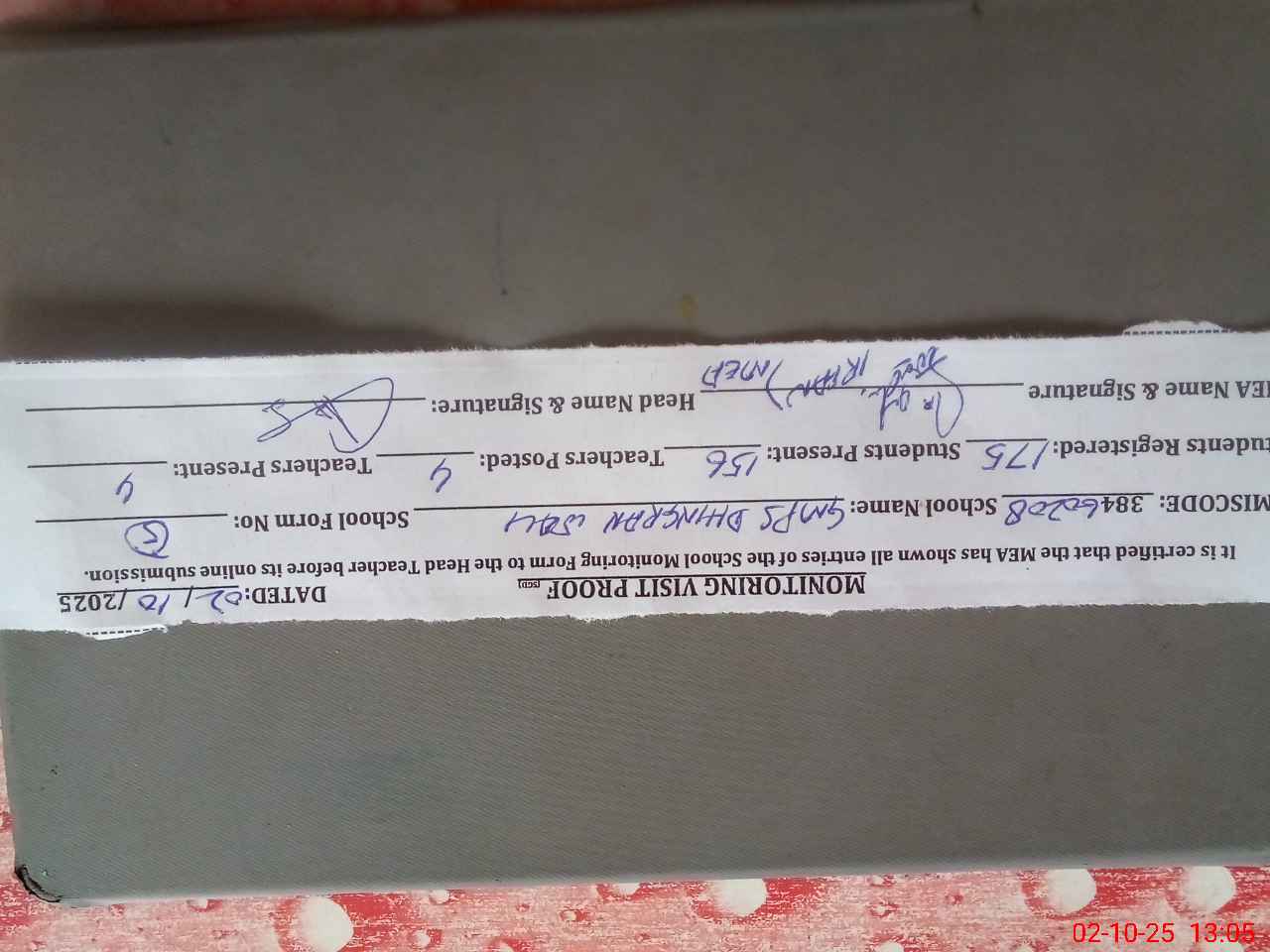 | Attendance Register | Head Teacher | MEA with School | Visit Proof |