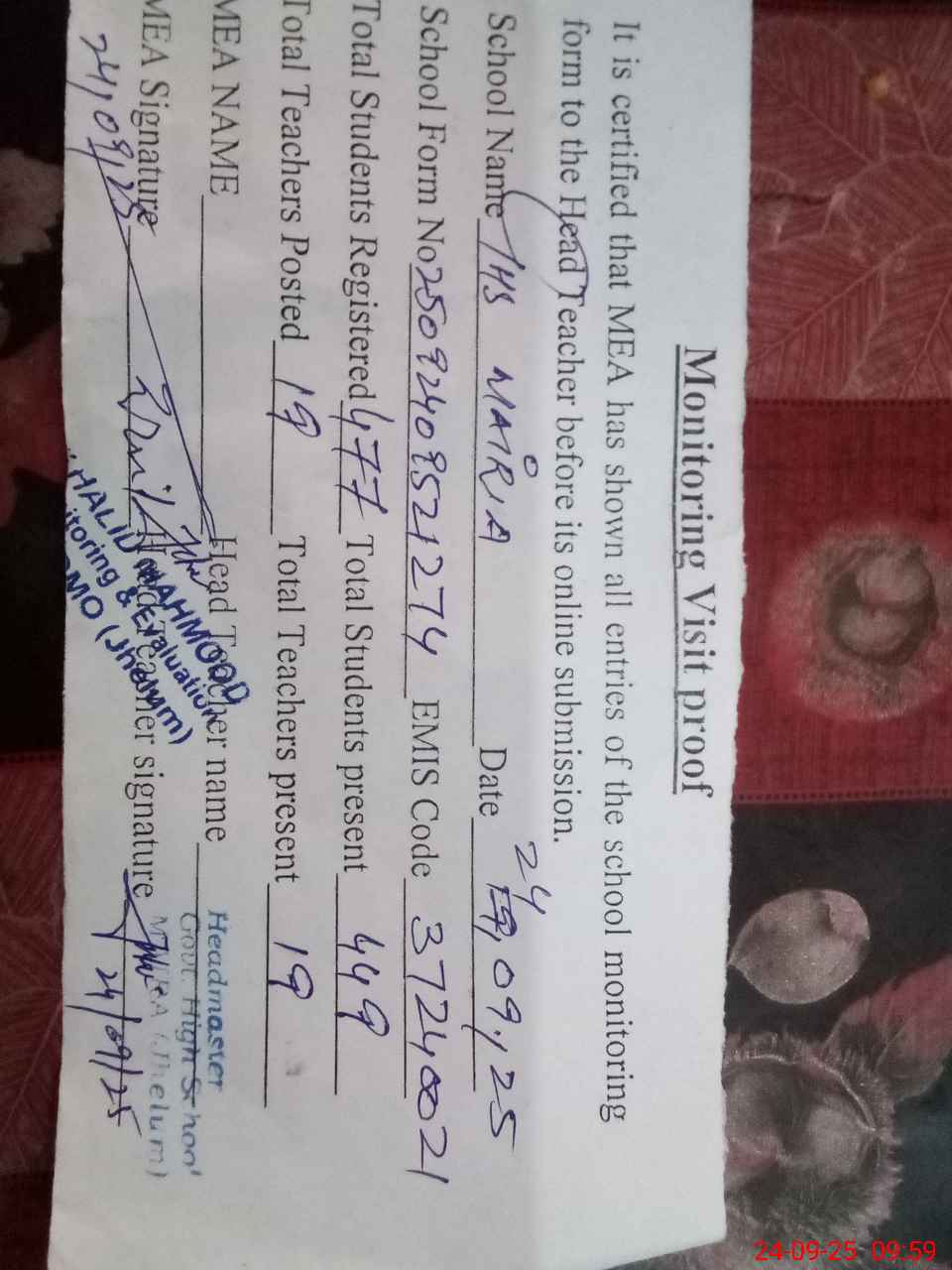 | Certified that this School was Inspected by the Undersigned MEA/DMO Today and the Information Stated Above is as Per Record. | |||||