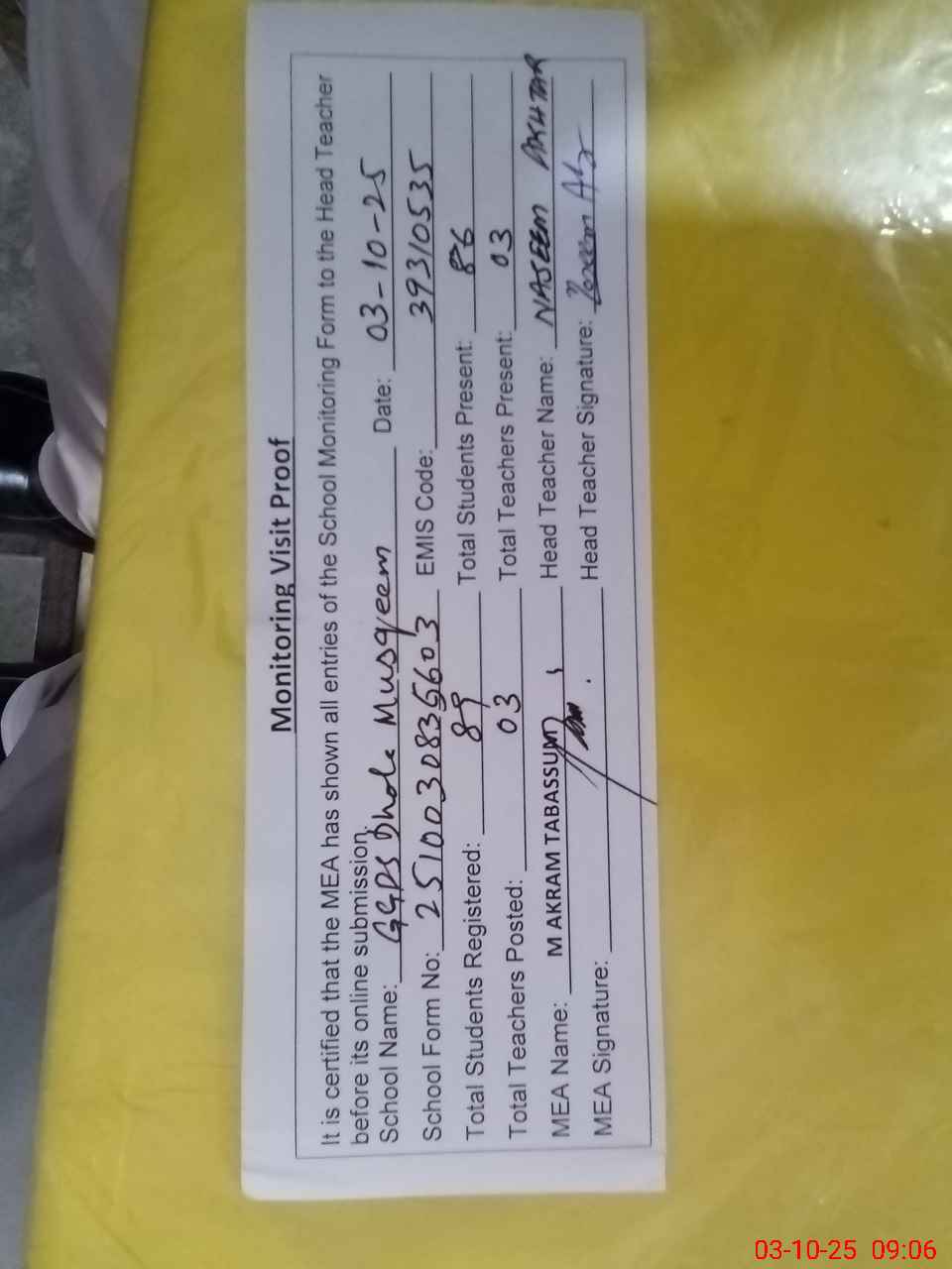 | Attendance Register | Head Teacher | MEA with School | Visit Proof |