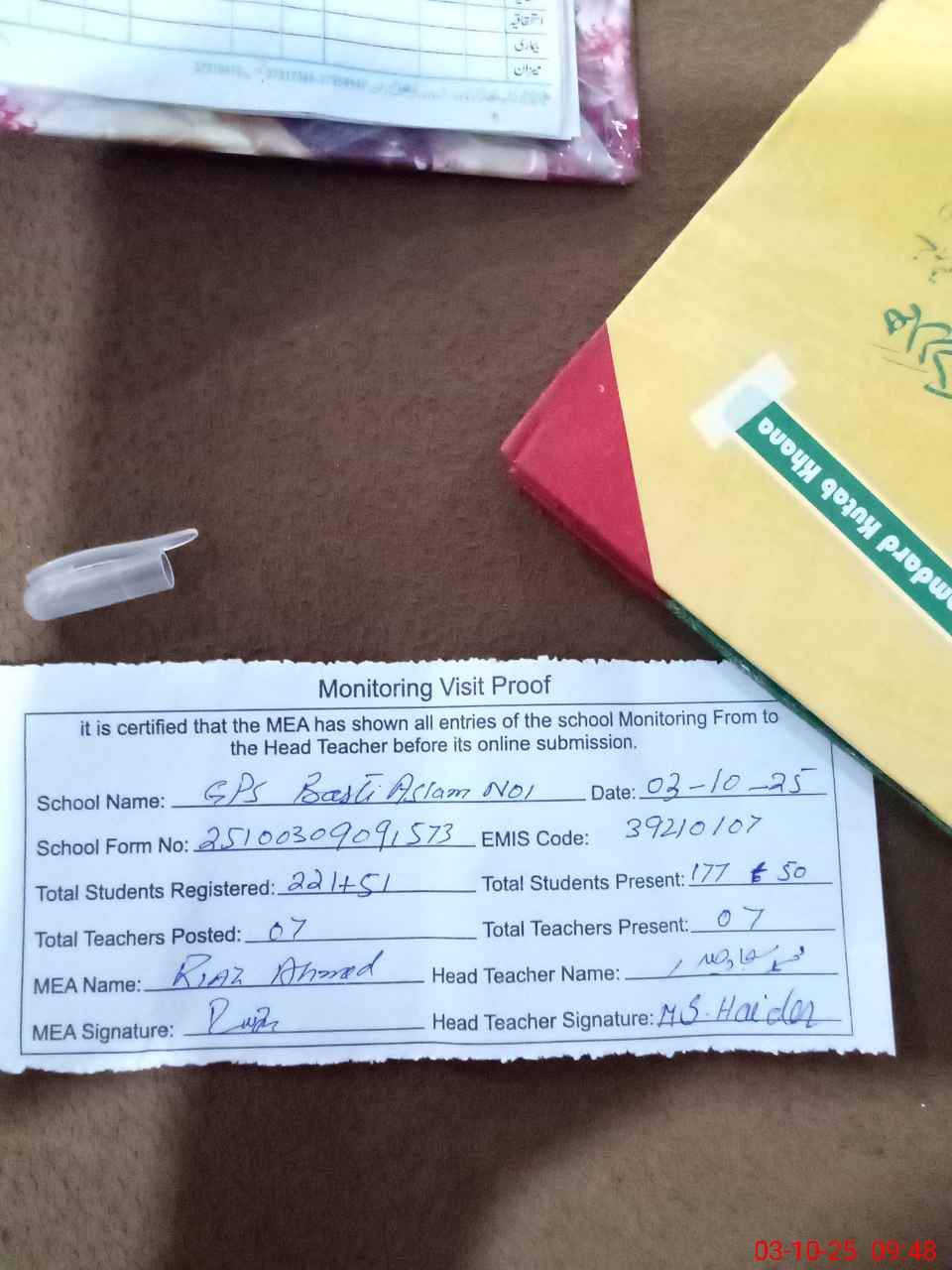 | EMIS Code: 39210107 | Name of School: GPS BASTI ASLAM NOI PAKPATTAN | |||