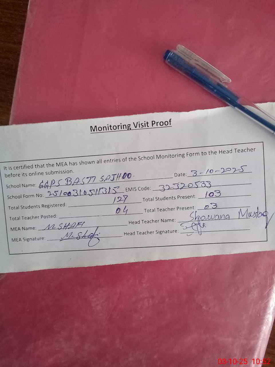 | Monitoring Date: 03-10-2025 | Start Time: 03-10-2025 10:16 AM | End Time: 03-10-2025 10:54 AM | Name of MEA: MU**** SH**** | |