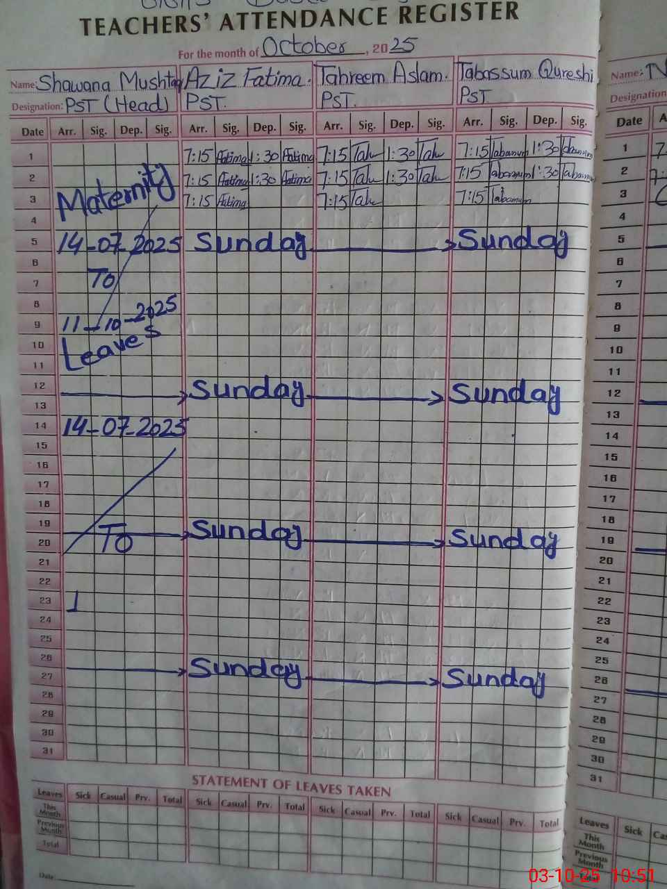 | 32**** | Sh**** Mu**** | PST | Regular | 30 | 0 | 0 | 30 | 0 | 0 | 0 | 0 | 0 | Maternity |