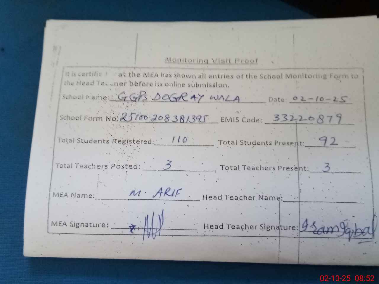 | Attendance Register | Head Teacher | MEA with School | Visit Proof |