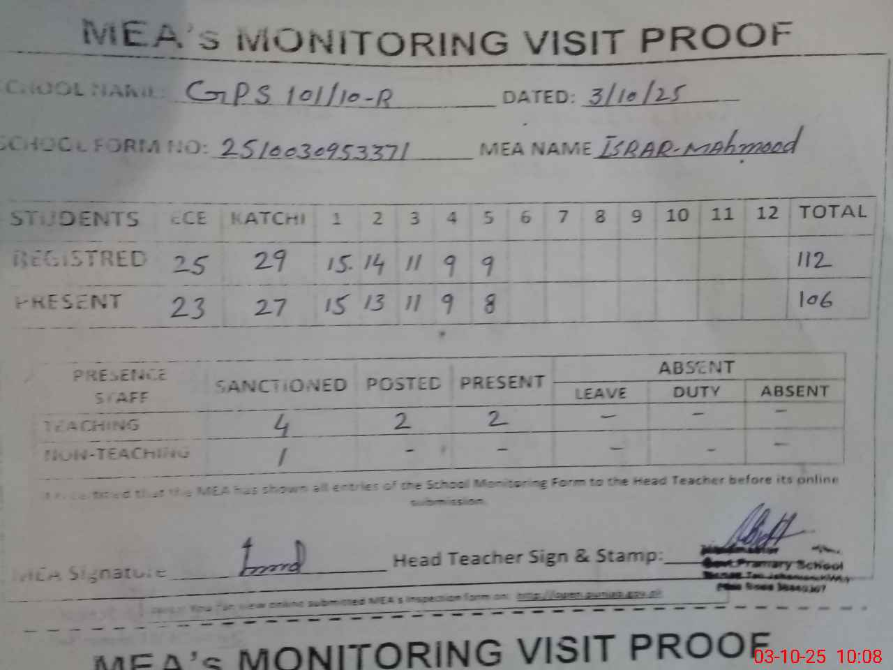 | Attendance Register | Head Teacher | MEA with School | Visit Proof |