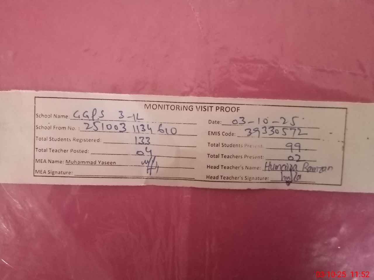| Monitoring Date: 03-10-2025 | Start Time: 03-10-2025 11:33 AM | End Time: 03-10-2025 11:54 AM | Name of MEA: MU**** YA**** | |