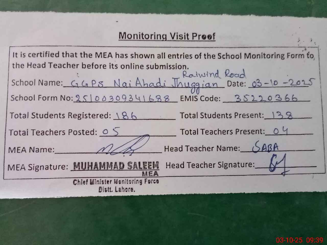 | EMIS Code: 35220366 | Name of School: GGPS NAI ABADI JHUGGIAN RAIWIND ROAD | |||
