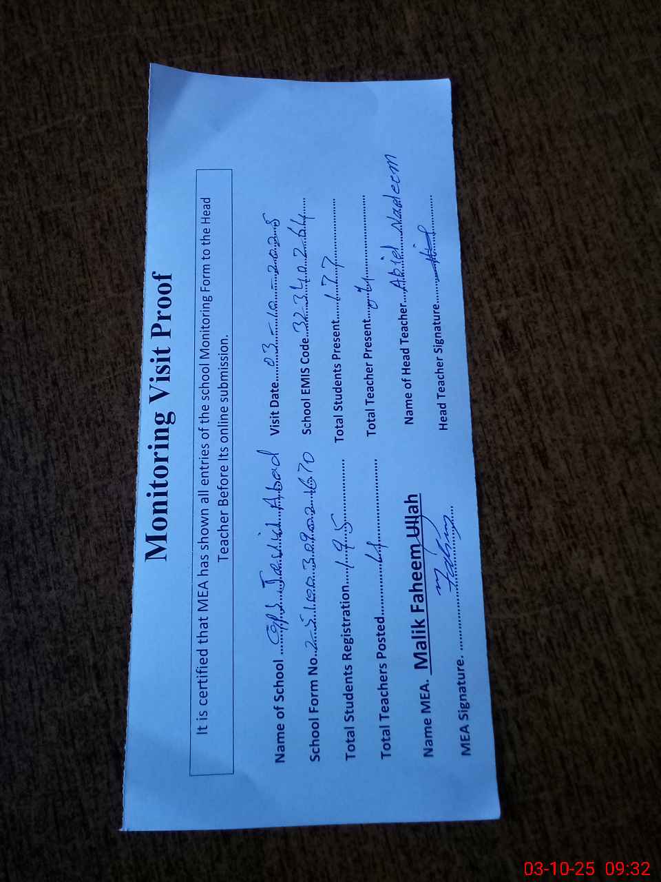 | Attendance Register | Head Teacher | MEA with School | Visit Proof |