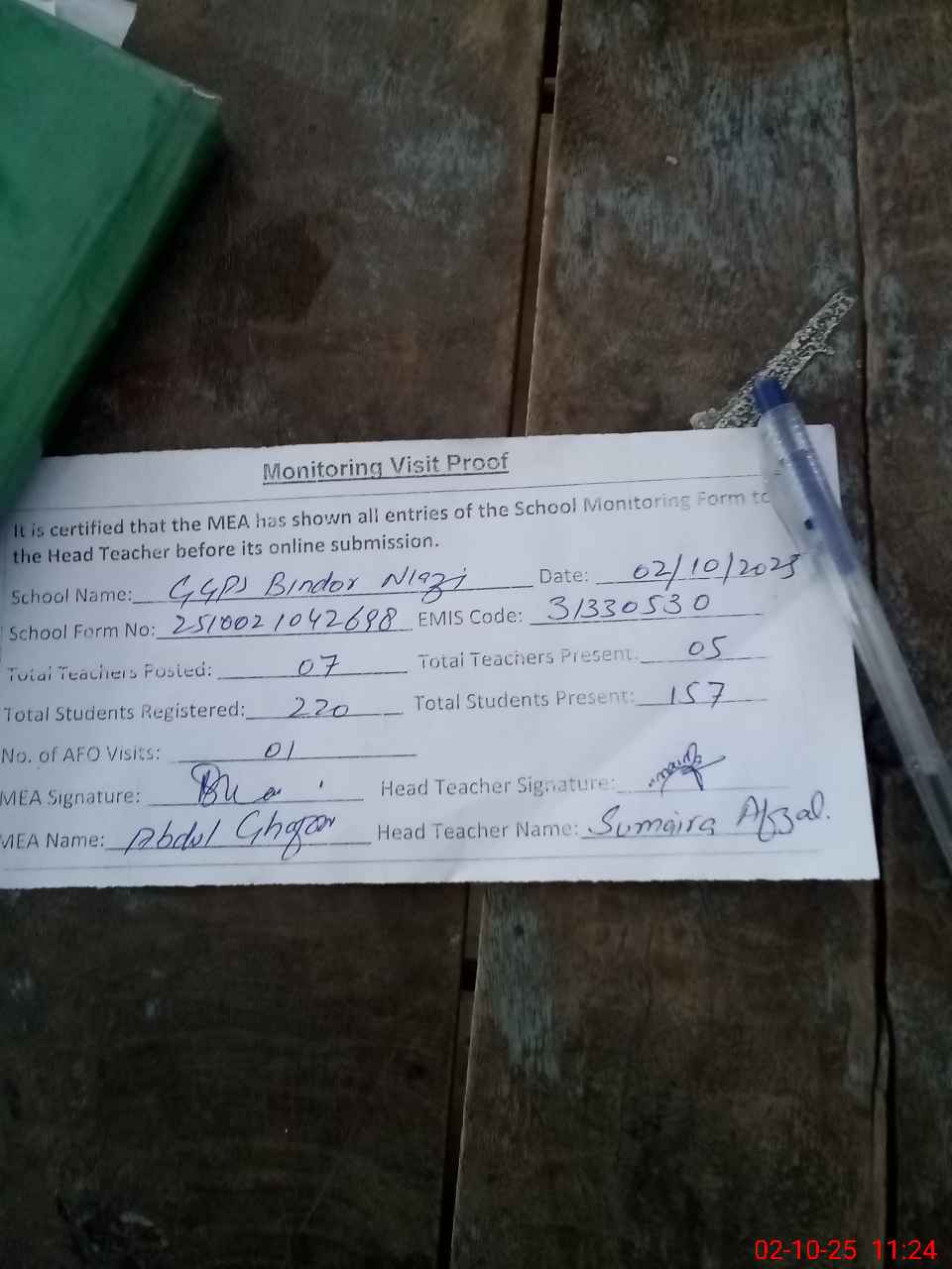 | Attendance Register | Head Teacher | MEA with School | Visit Proof |