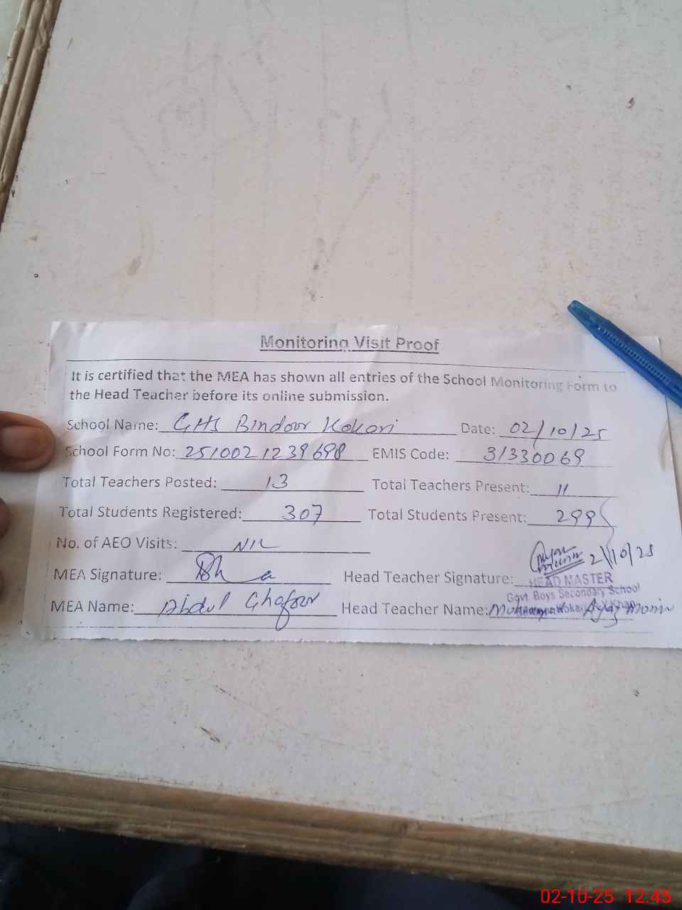 | EMIS Code: 31330069 | Name of School: GHS BINDOOR KOKARI | |||