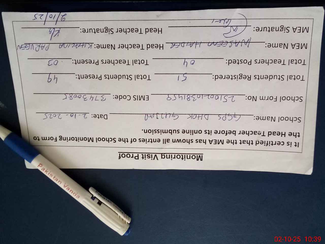 | Certified that this School was Inspected by the Undersigned MEA/DMO Today and the Information Stated Above is as Per Record. | |||||
