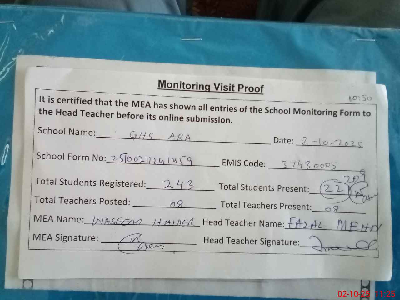 | Attendance Register | Head Teacher | MEA with School | Visit Proof |