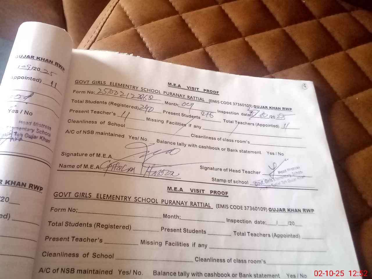 | Certified that this School was Inspected by the Undersigned MEA/DMO Today and the Information Stated Above is as Per Record. | |||||