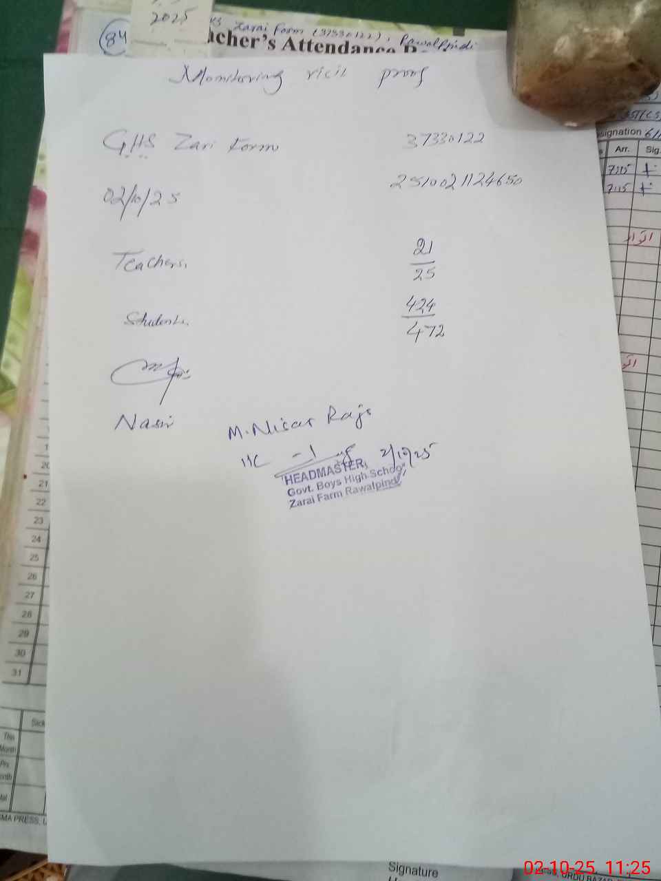 | Attendance Register | Head Teacher | MEA with School | Visit Proof |