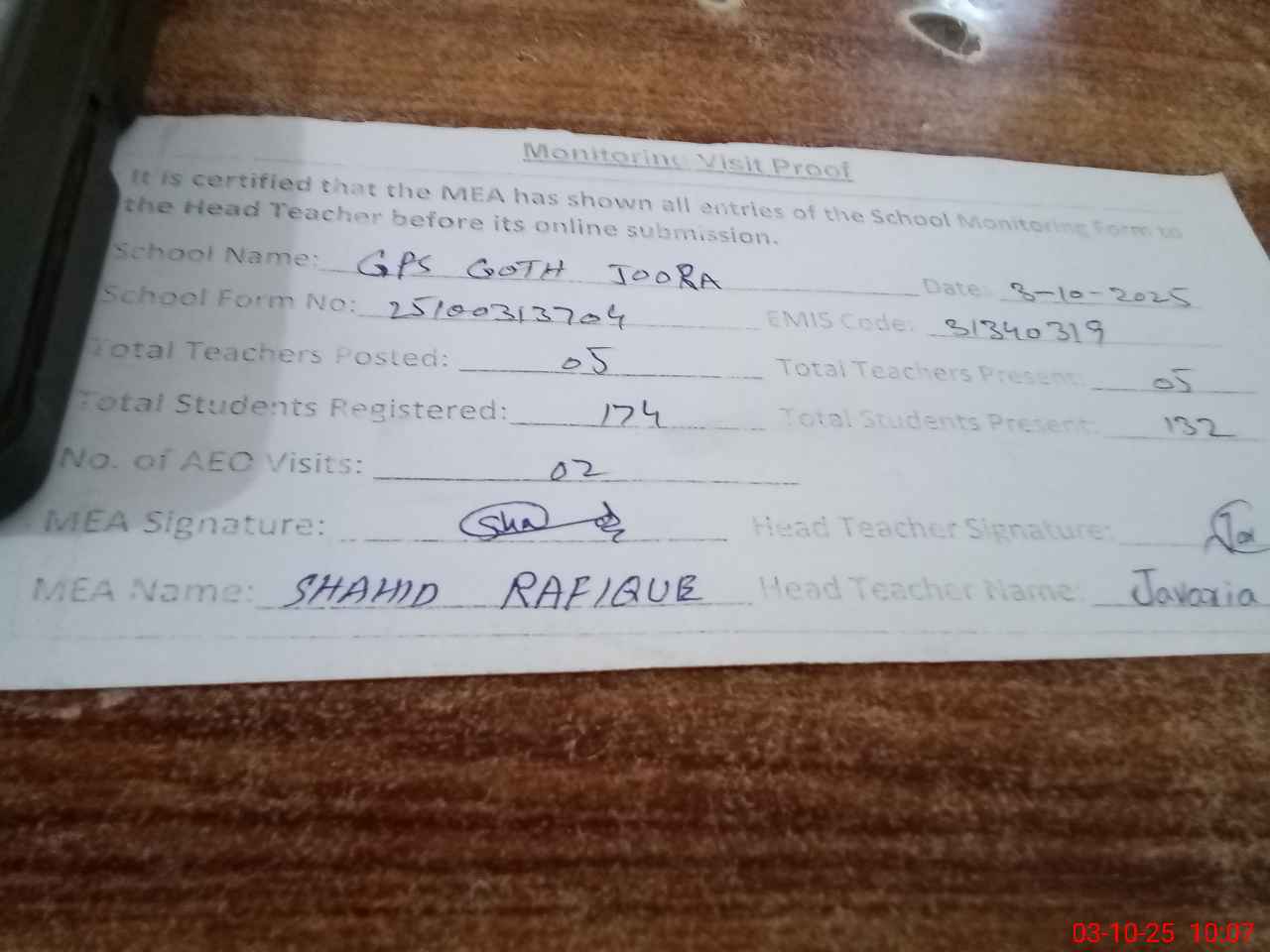 | EMIS Code: 31340319 | Name of School: GPS GOTH JOORA | |||