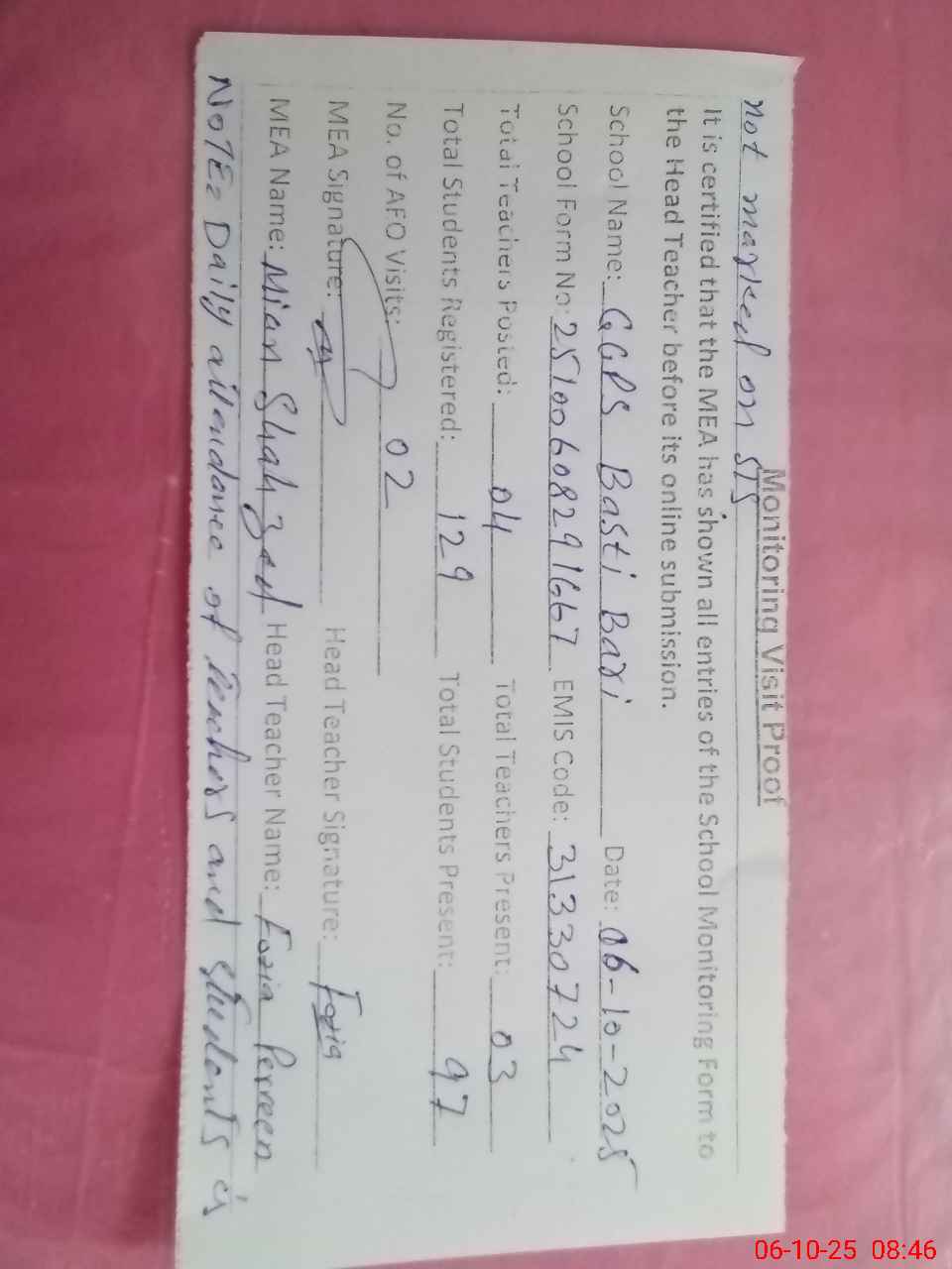 | Attendance Register | Head Teacher | MEA with School | Visit Proof |