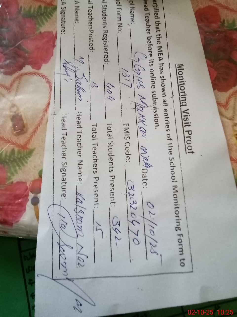 | Attendance Register | Head Teacher | MEA with School | Visit Proof |
