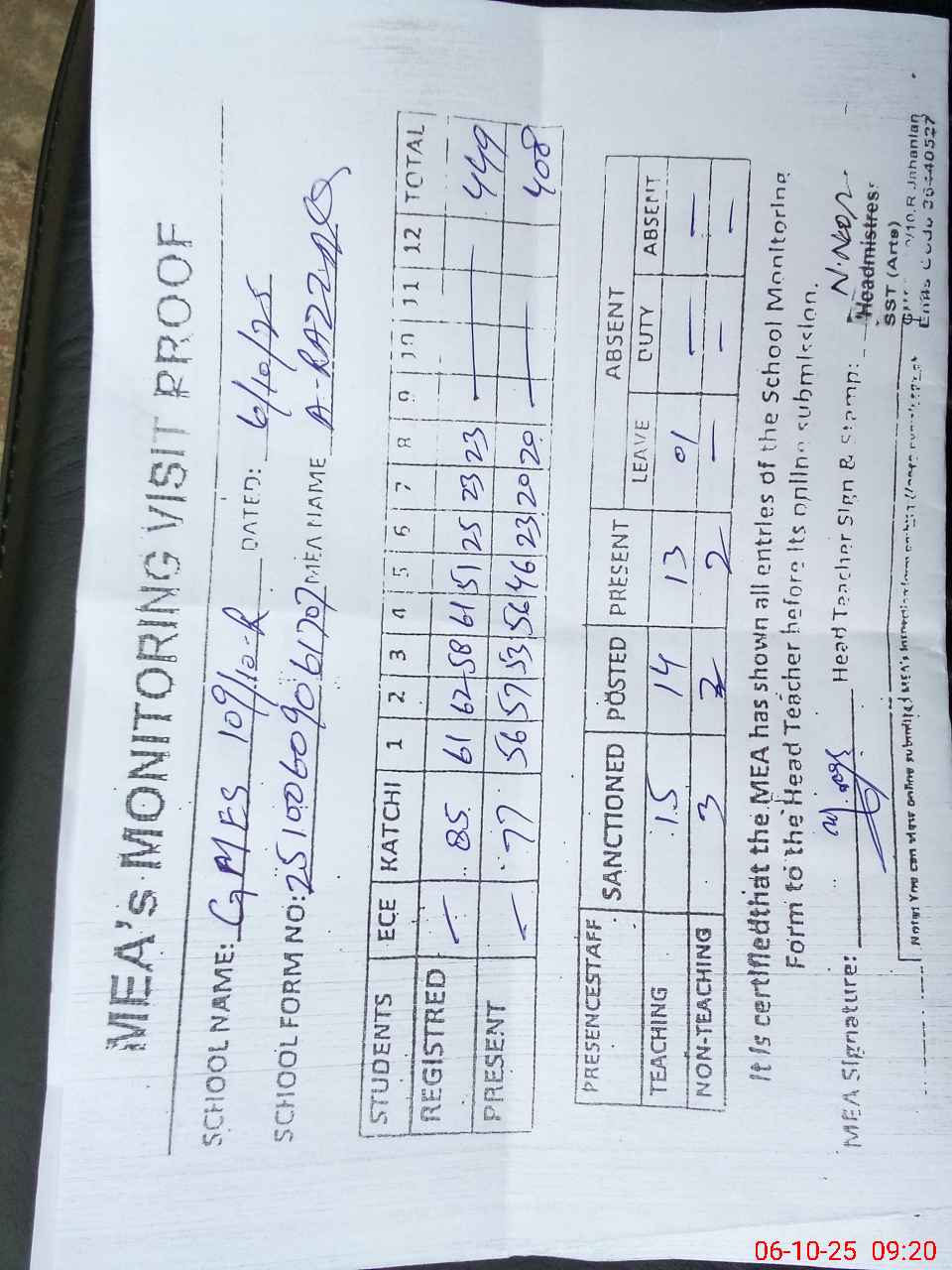 | Attendance Register | Head Teacher | MEA with School | Visit Proof |