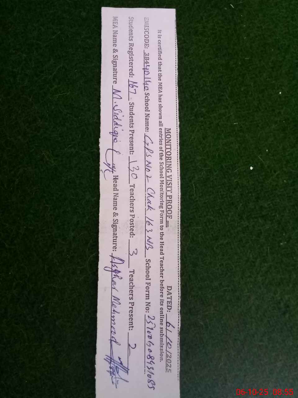 | Certified that this School was Inspected by the Undersigned MEA/DMO Today and the Information Stated Above is as Per Record. | |||||