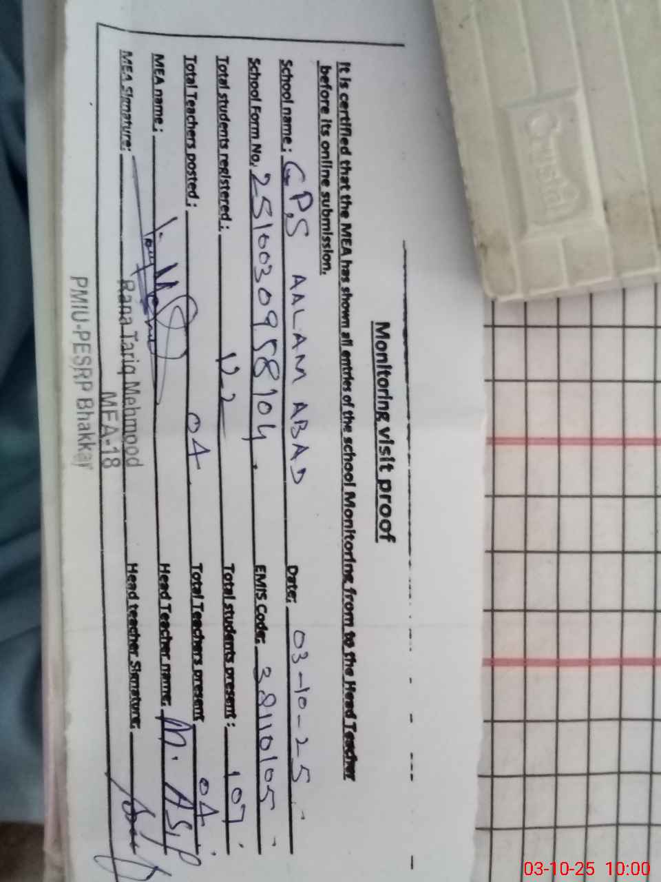 | Name: Mu**** As**** Designation: (School Headmaster's/Headmistress's) PST Phone/Cell Number: 03**** |