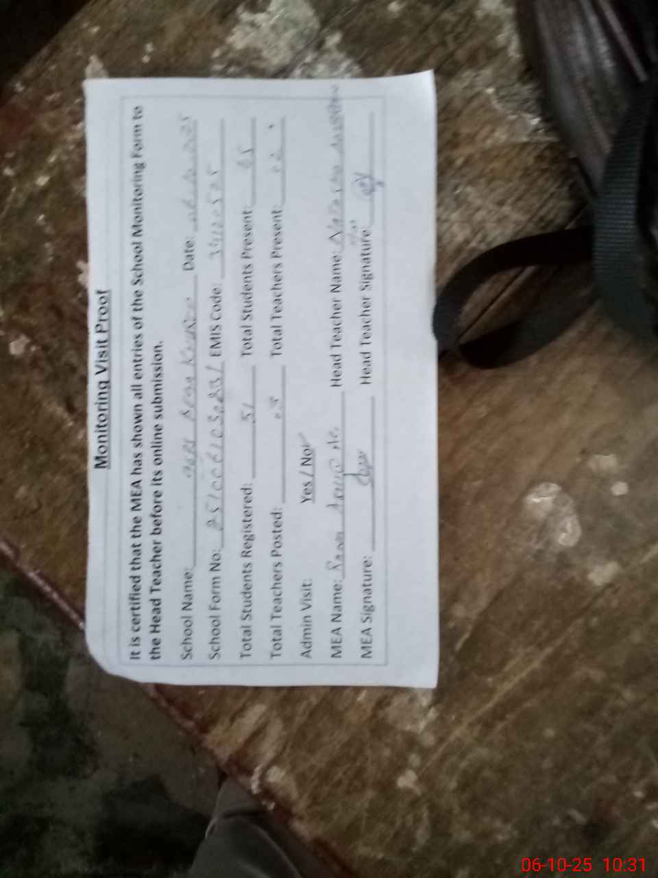| Attendance Register | Head Teacher | MEA with School | Visit Proof |