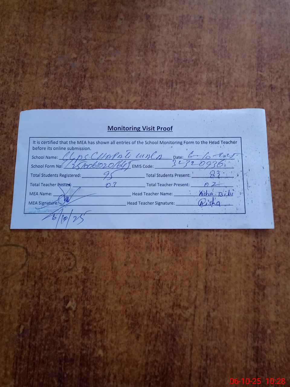 | Attendance Register | Head Teacher | MEA with School | Visit Proof |