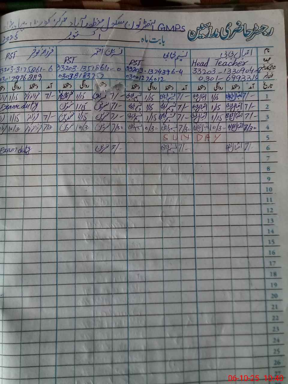 | 33**** | Fa**** Ka**** | PST | Regular | 0 | 0 | 0 | 0 | 0 | 0 | 0 | 0 | 0 | Exam Duty |