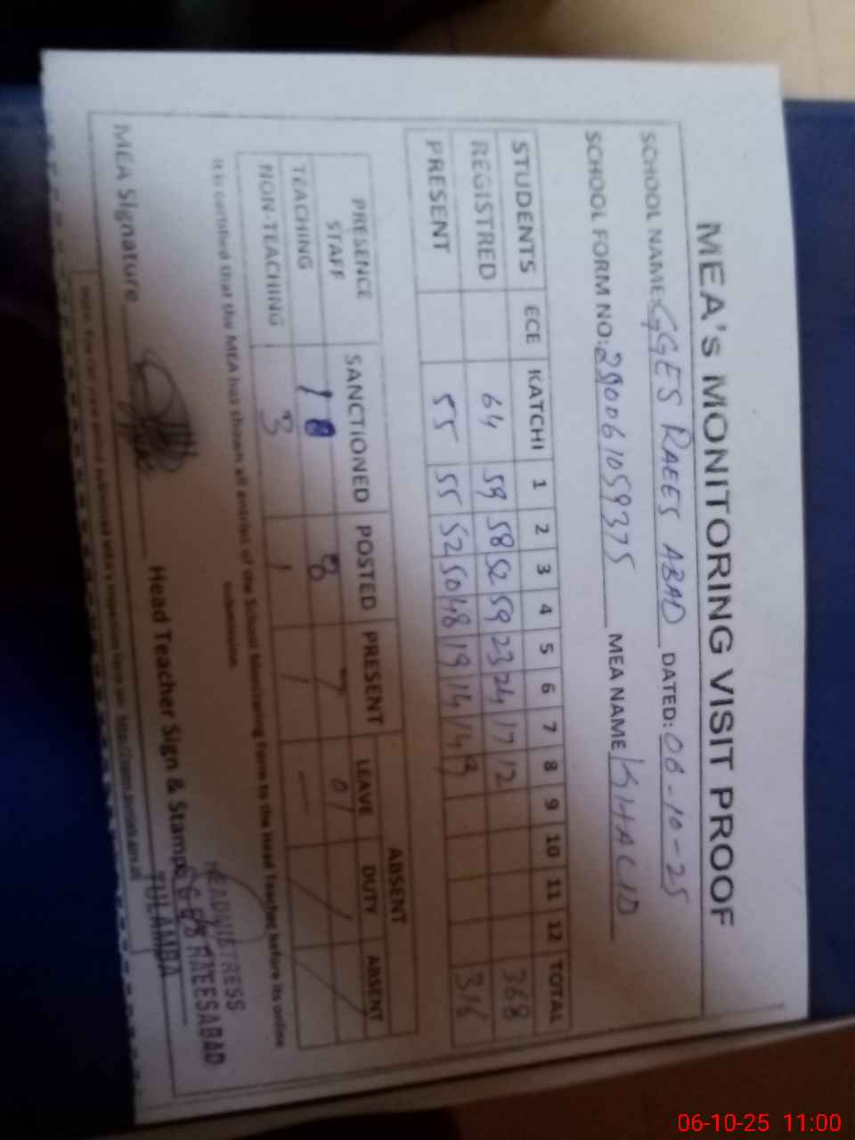 | Attendance Register | Head Teacher | MEA with School | Visit Proof |