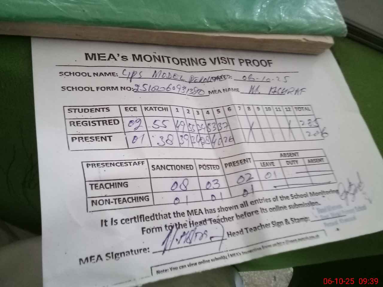 | Attendance Register | Head Teacher | MEA with School | Visit Proof |