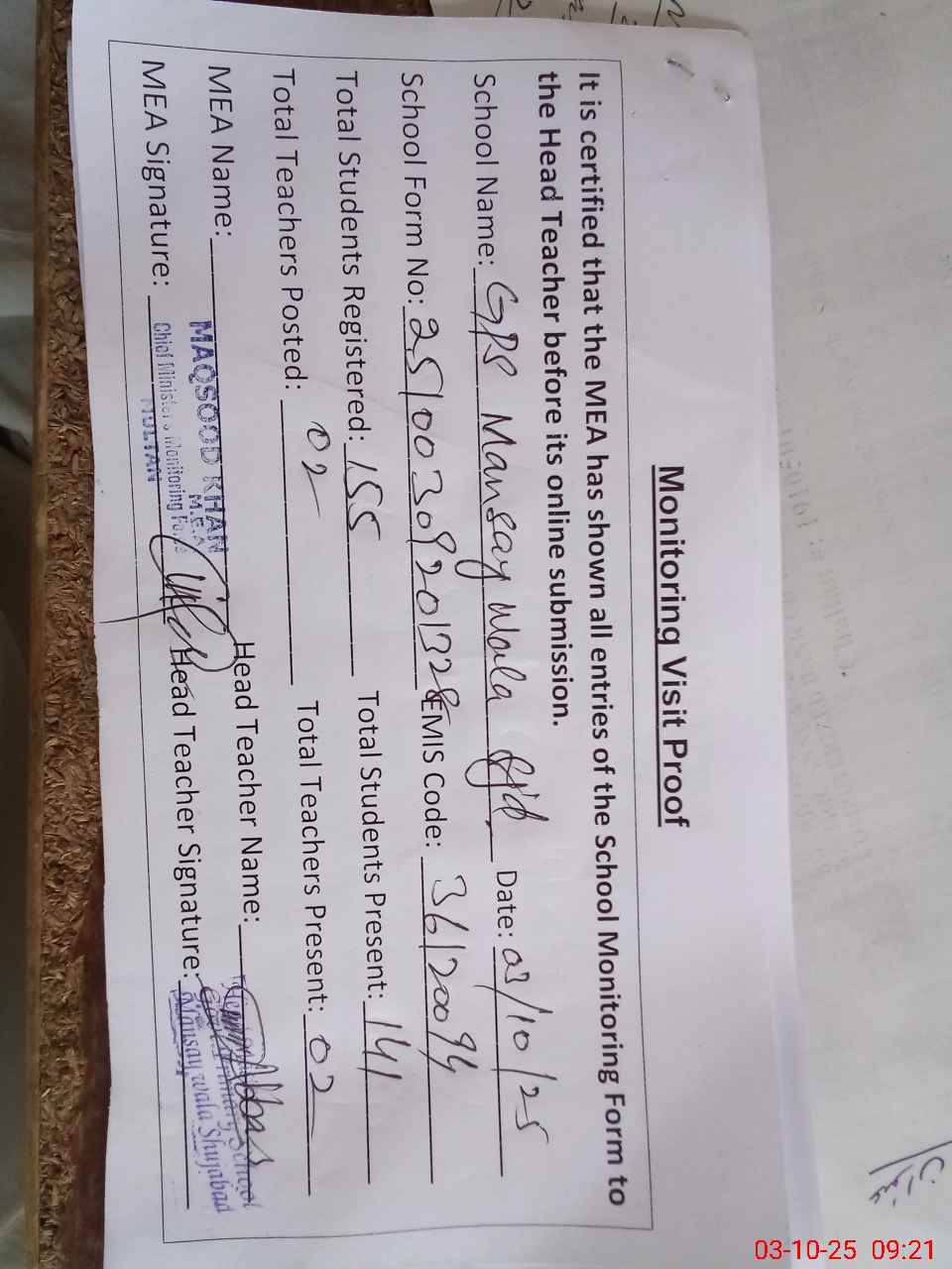 | Attendance Register | Head Teacher | MEA with School | Visit Proof |