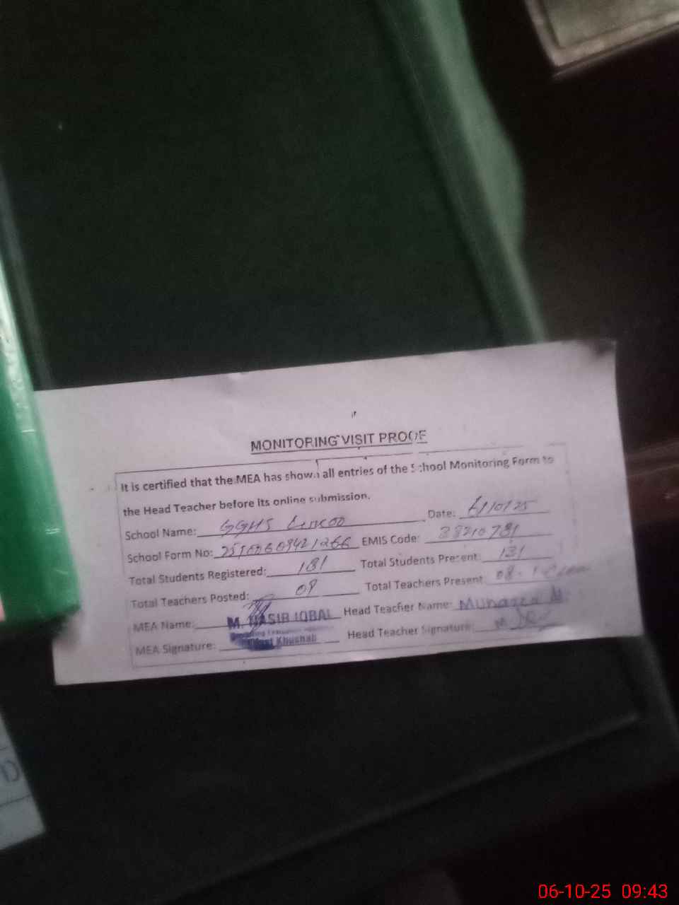 | Certified that this School was Inspected by the Undersigned MEA/DMO Today and the Information Stated Above is as Per Record. | |||||