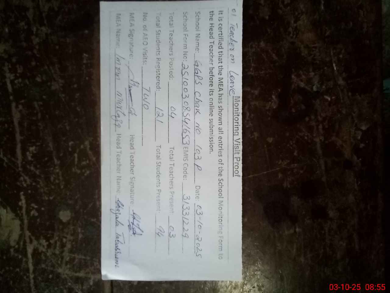 | Attendance Register | Head Teacher | MEA with School | Visit Proof |