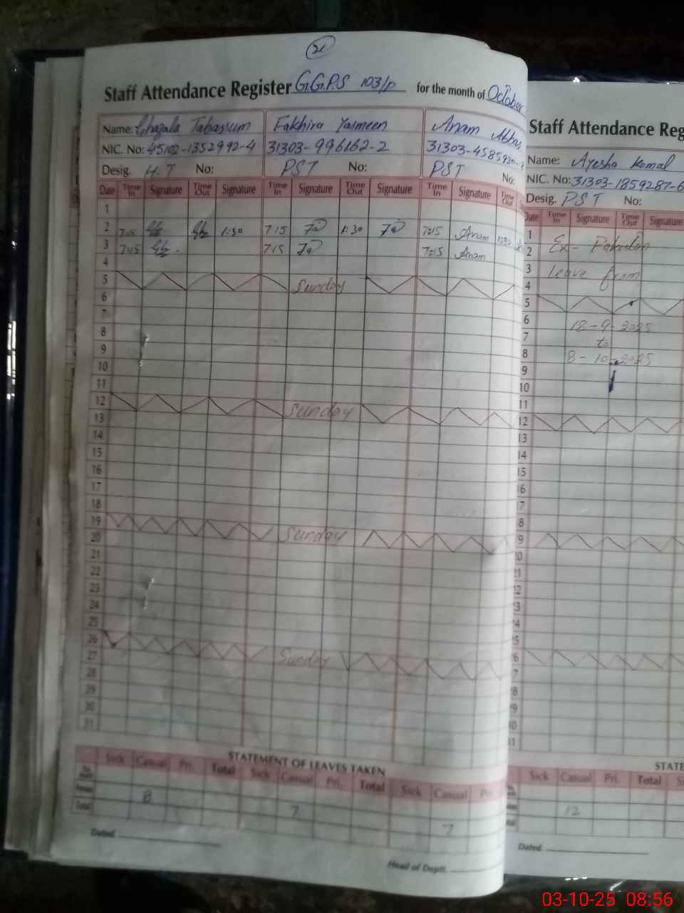 | CNIC | Full Name | Designation | R/C | Absence During Last Calender Month |