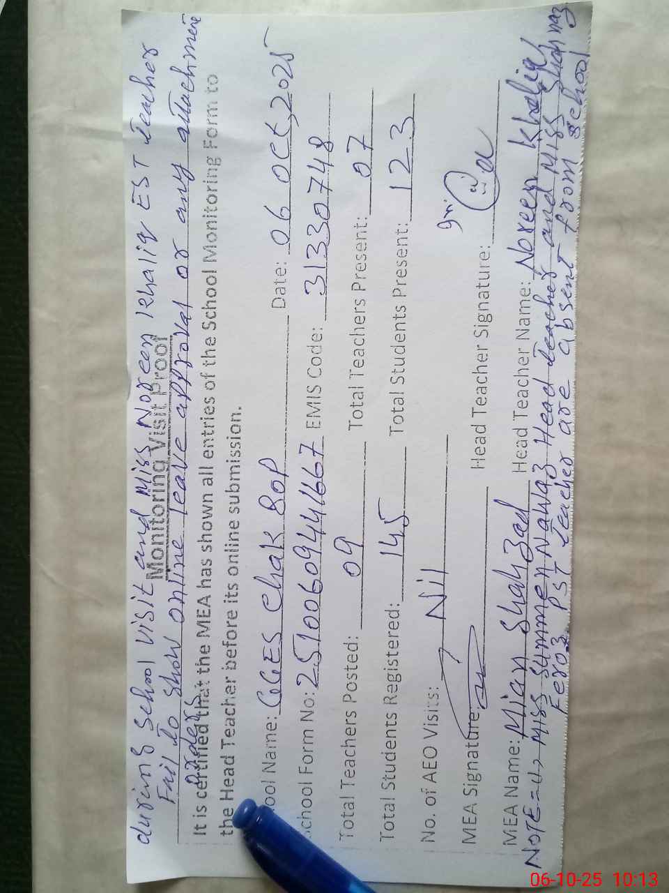 | Remarks (Use Separate Page if Required): Miss Summen Nawaz head teacher and miss Shenaz Feroz PST teacher are absent from school during school visit and miss Khaliq EST teacher fail to show online leave approval or any attachments orders | |||||