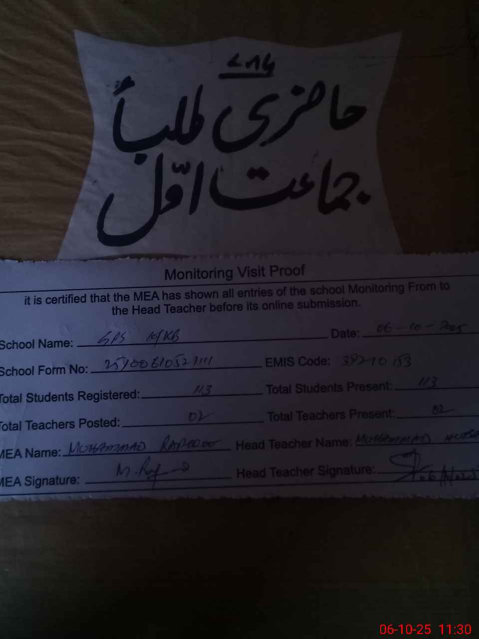 | Attendance Register | Head Teacher | MEA with School | Visit Proof |
