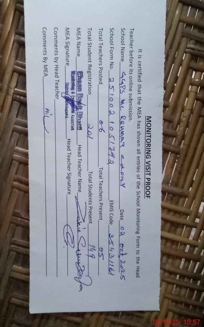 | Attendance Register | Head Teacher | MEA with School | Visit Proof |