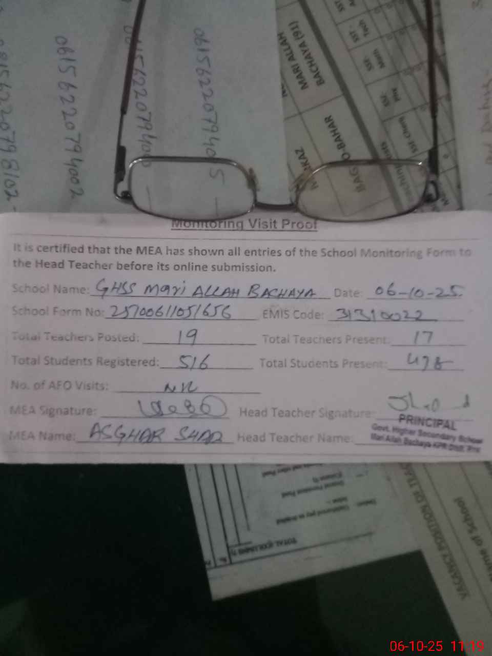| Monitoring Date: 06-10-2025 | Start Time: 06-10-2025 10:41 AM | End Time: 06-10-2025 11:19 AM | Name of MEA: Mu**** As**** Sh**** | |