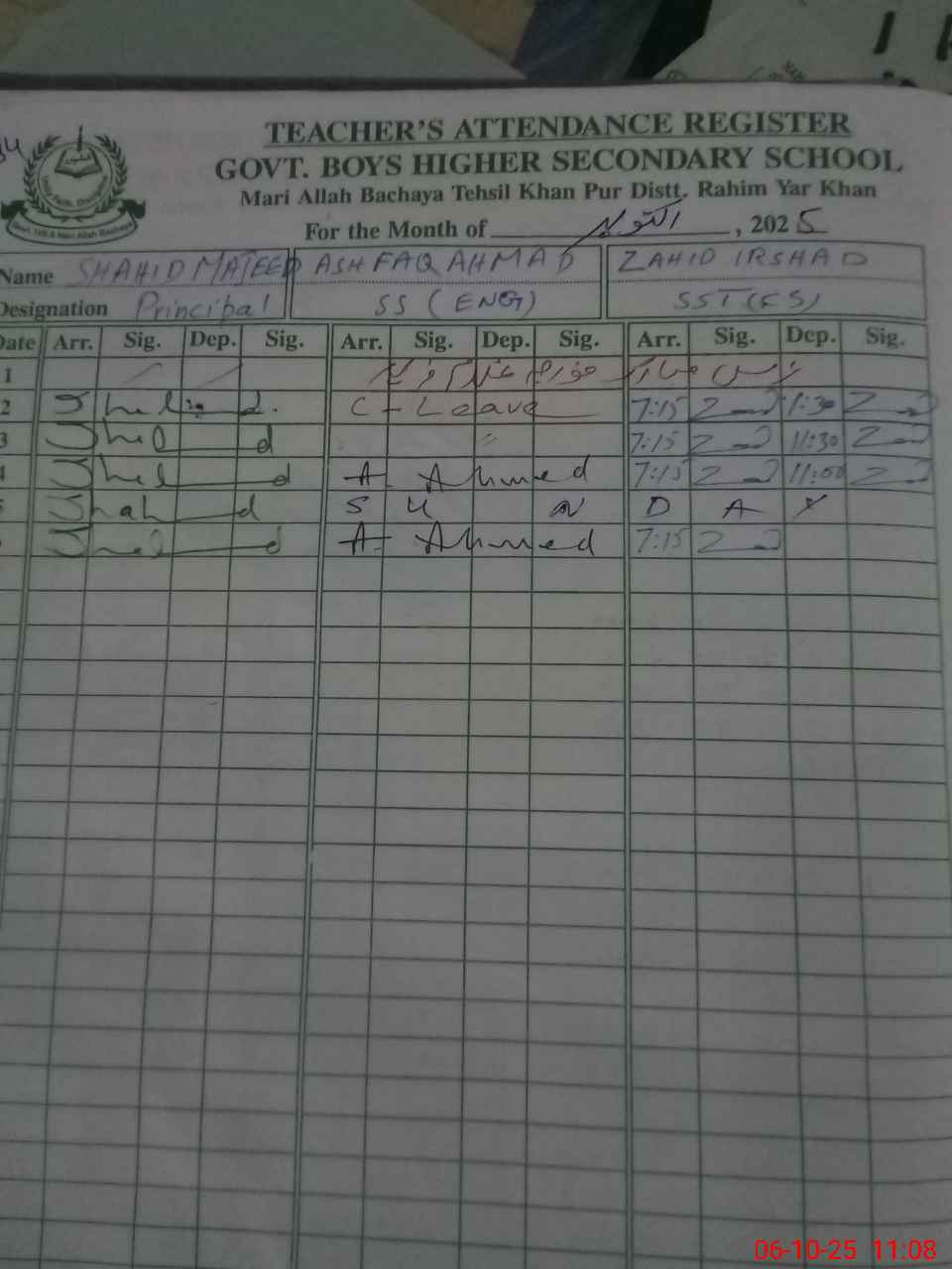 | Name: Sh**** Ma**** Designation: (School Headmaster's/Headmistress's) Principal Phone/Cell Number: 03**** |