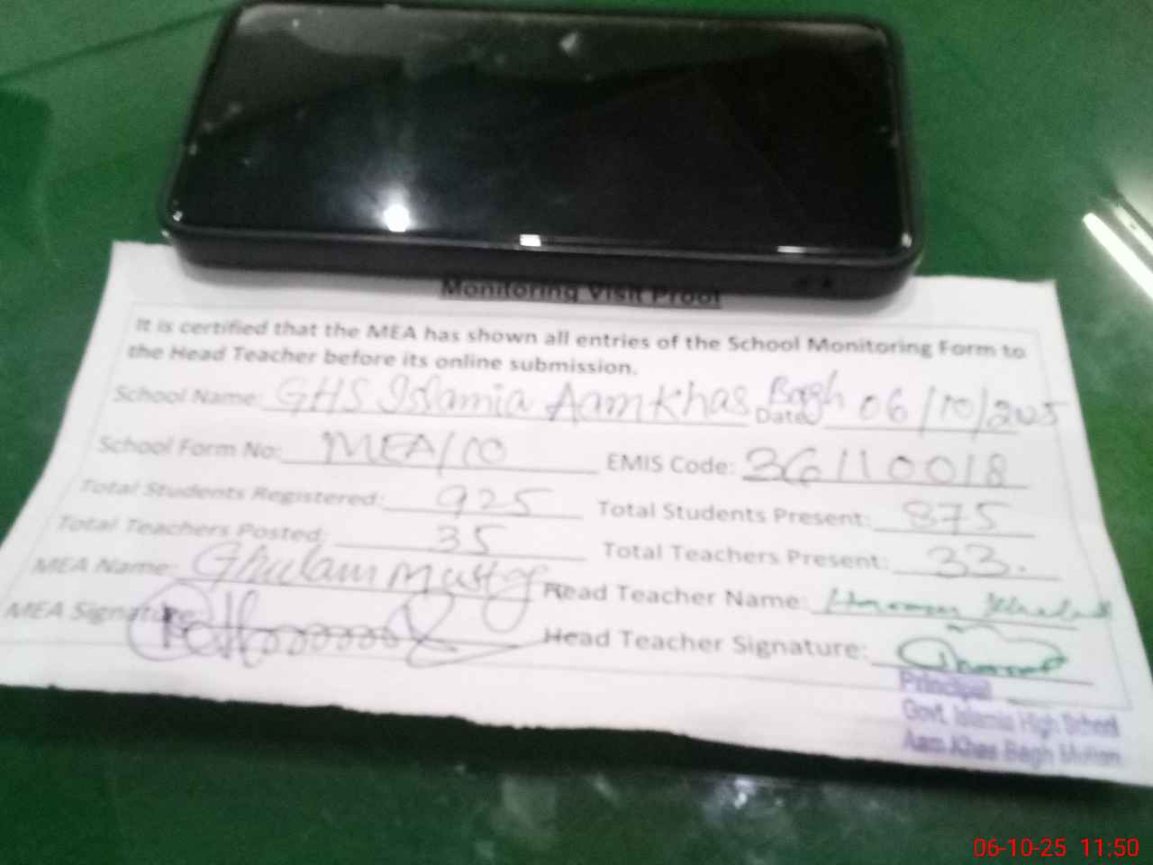 | Monitoring Date: 06-10-2025 | Start Time: 06-10-2025 10:46 AM | End Time: 06-10-2025 11:50 AM | Name of MEA: GH**** MU**** | |