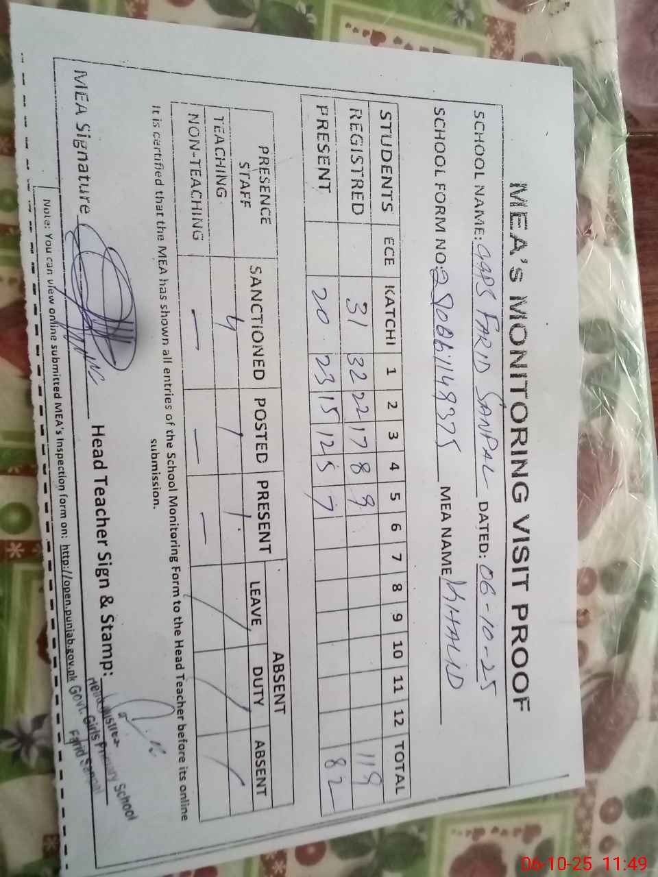 | Attendance Register | Head Teacher | MEA with School | Visit Proof |
