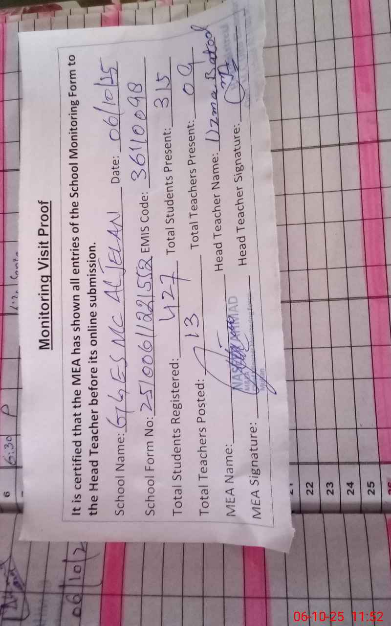 | EMIS Code: 36110098 | Name of School: GGES MC AL-JEELAN MULTAN | |||