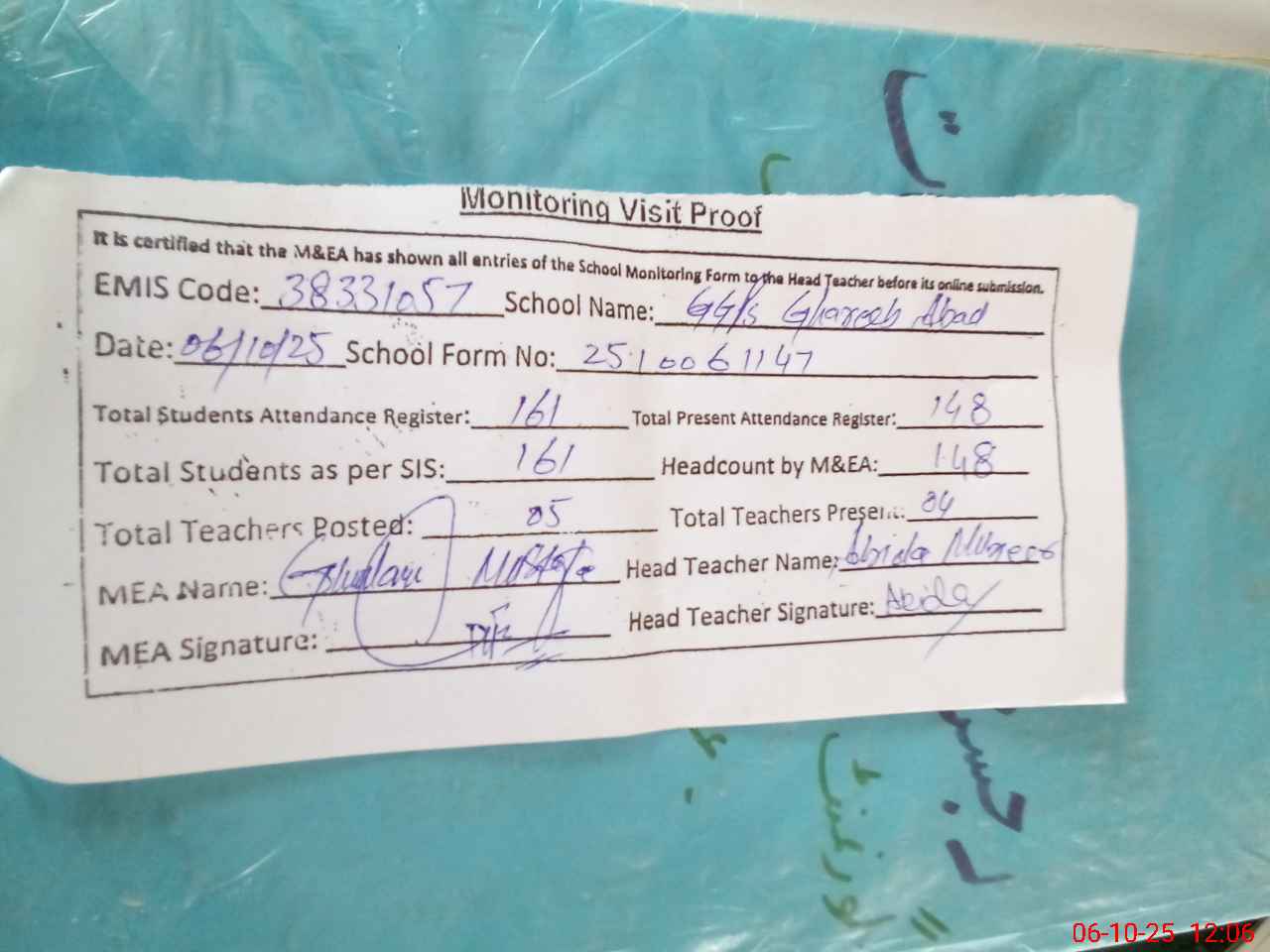 | Attendance Register | Head Teacher | MEA with School | Visit Proof |