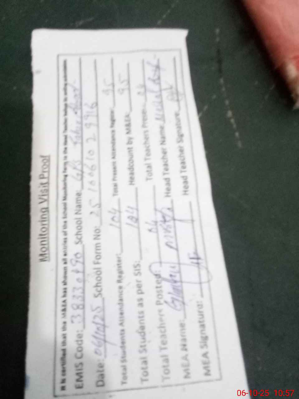 | Attendance Register | Head Teacher | MEA with School | Visit Proof |